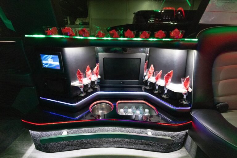 Multiple Bar Areas & DOT-Certified Safety We prioritize your group’s security without compromising on style. This vehicle is DOT-certified for up to 22 passengers with integrated seatbelts. The cabin features multiple full-service bars stocked with integrated ice bins, crystal glassware, and chilled bottled water, supported by a professional chauffeur for point-to-point coordination.